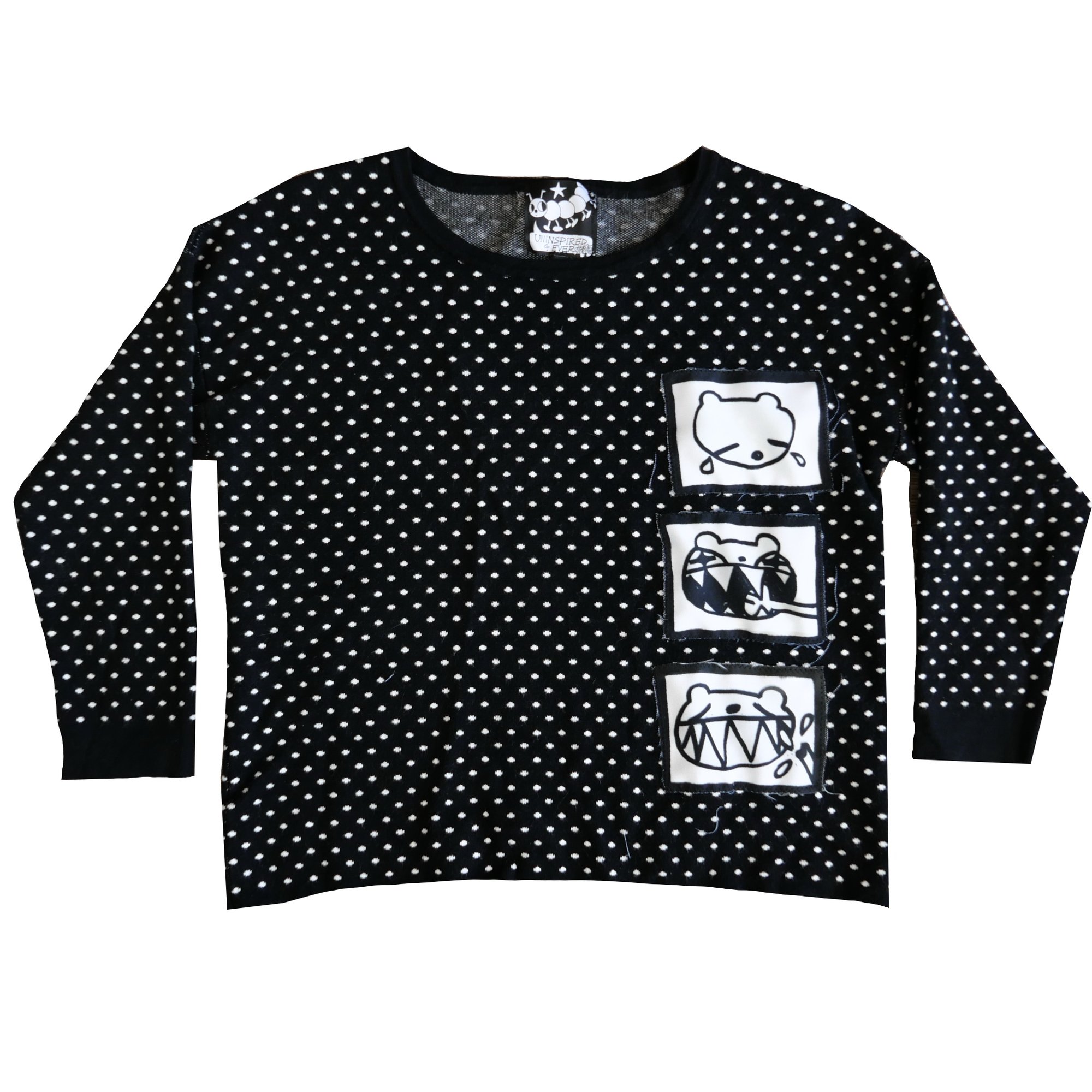 polkadot knit top with hand printed patches of osito being mad and eating someone's hand off