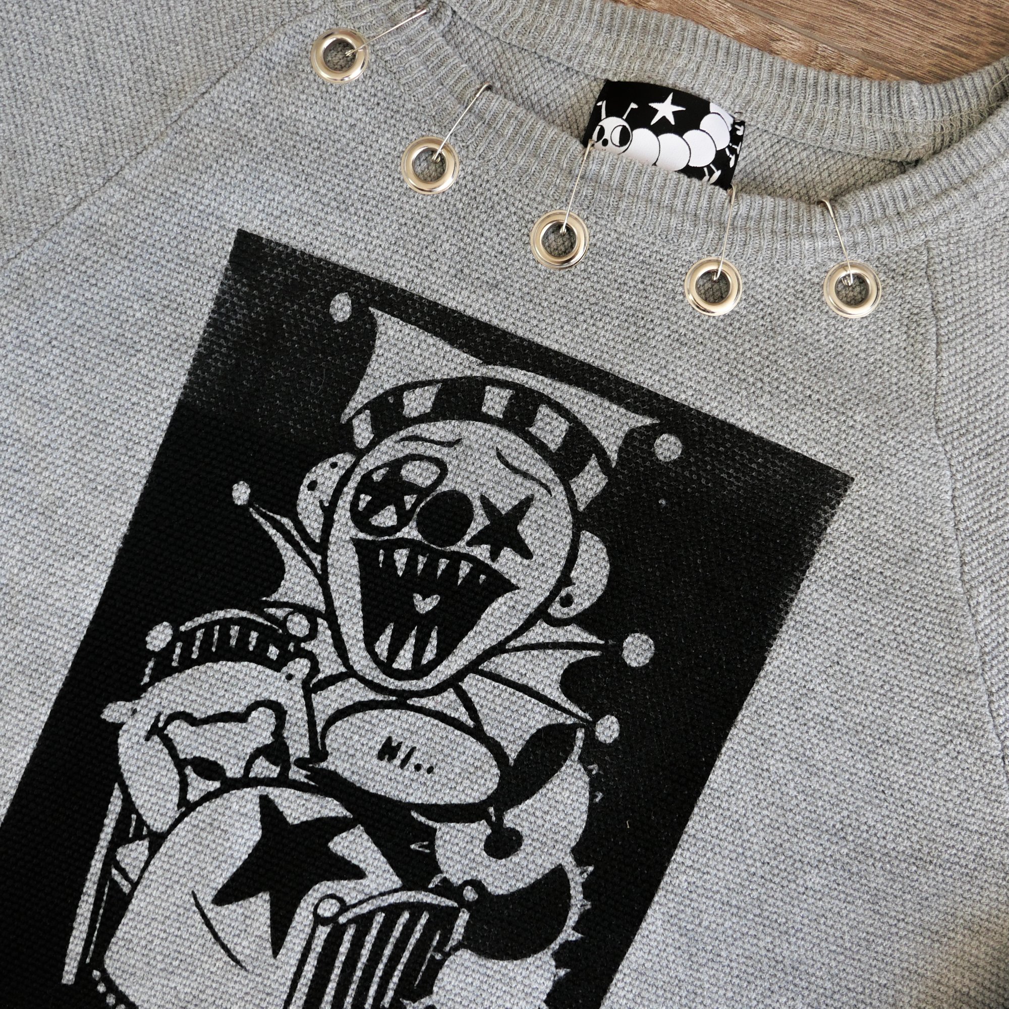 knit raglan sweater with screen printed design and grommets with safety pin details