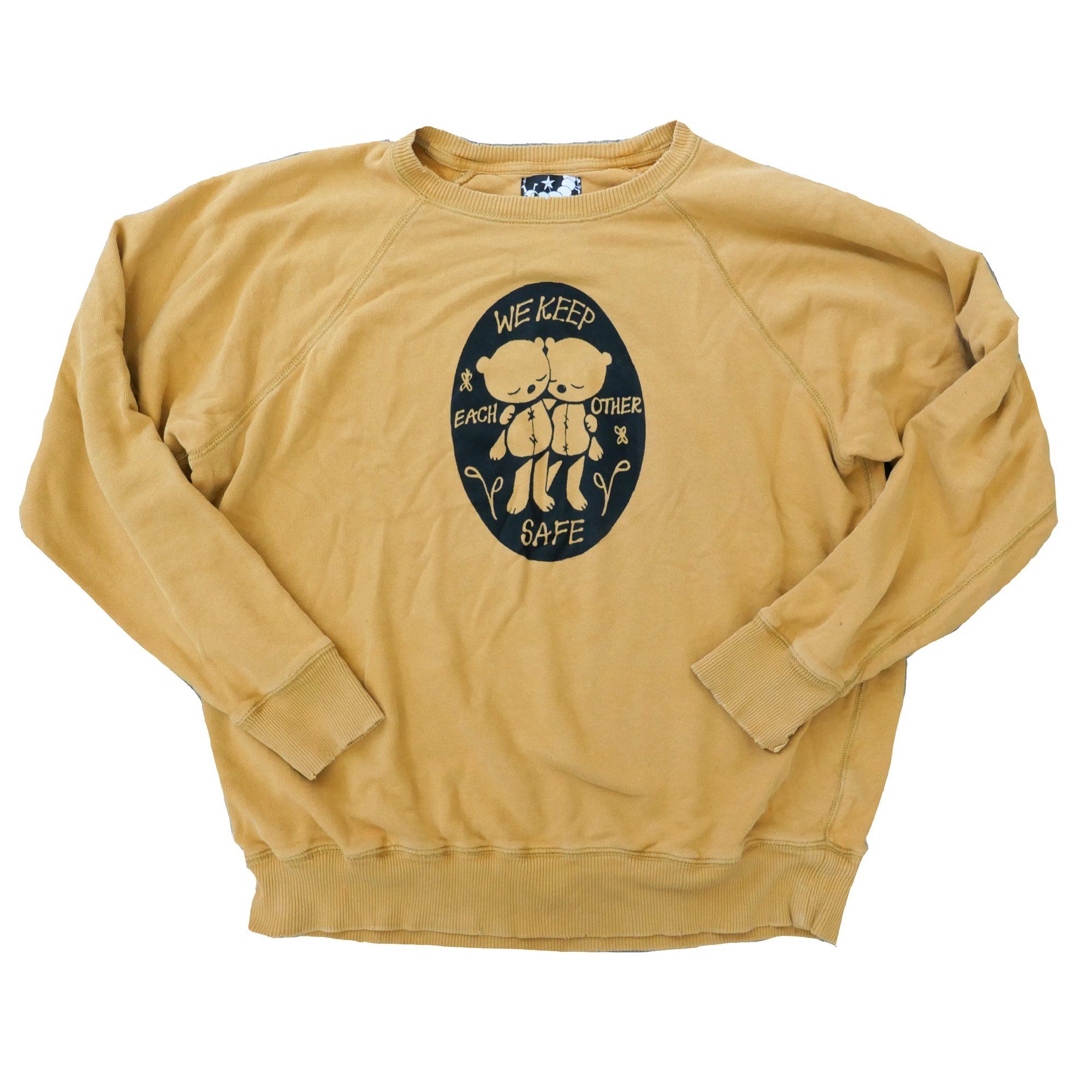 1/1 one of a kind distressed mustard yellow raglan sweater with the we keep other safe design screen printed onto it size M (∗˃̶ ᵕ ˂̶∗)