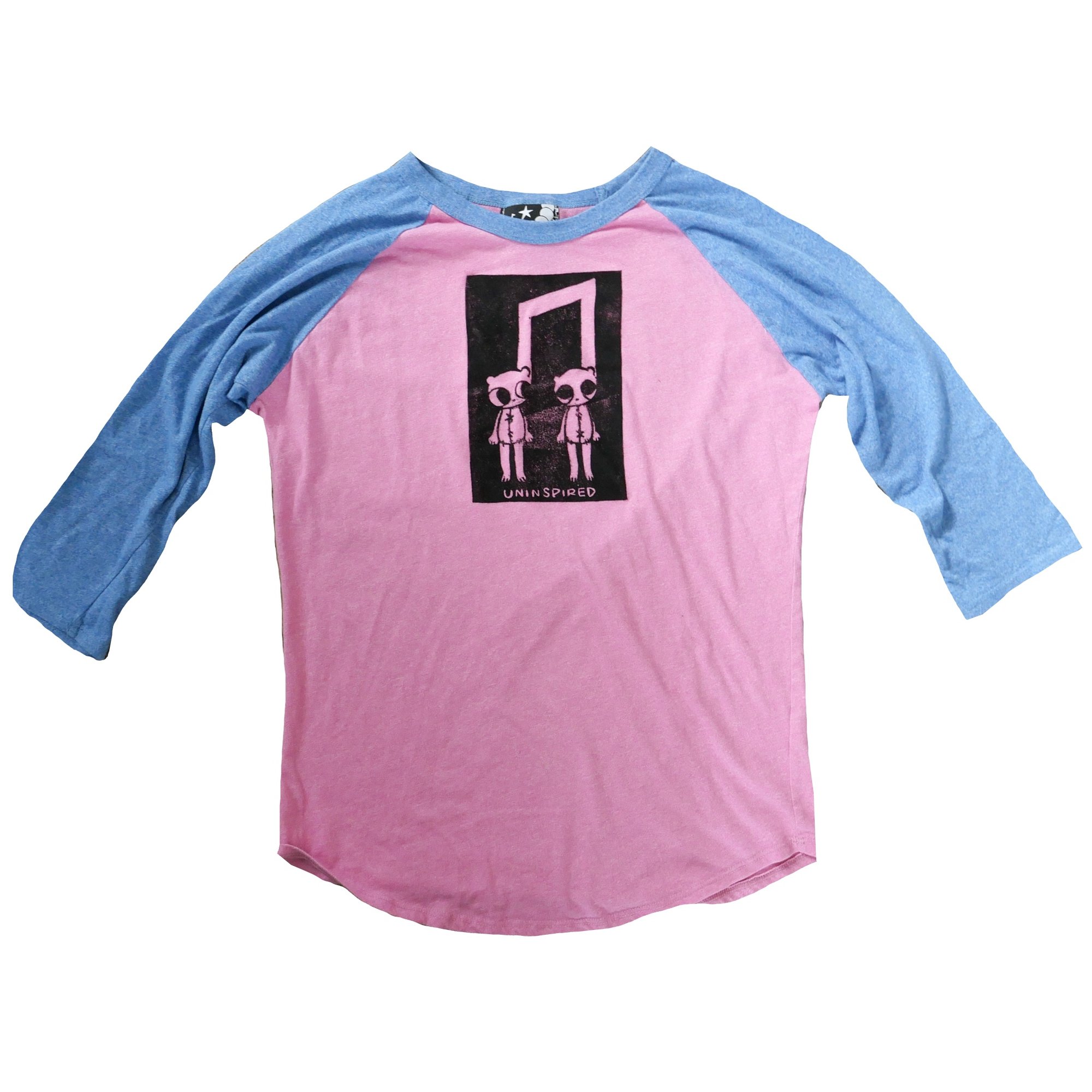 blue and pink baseball tee with block printed design
