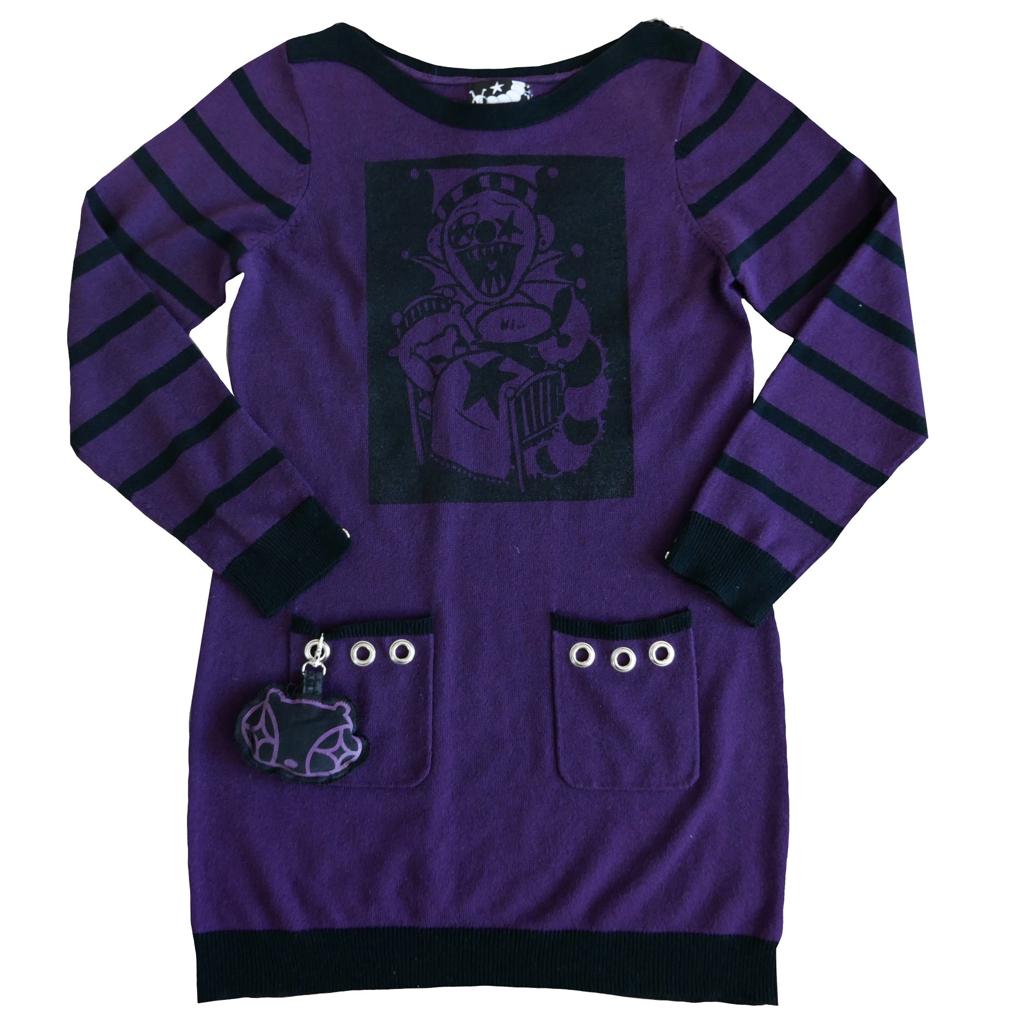 1/1 one of a kind purple knit dress with striped sleeves, screen printed design, grommets, and screen printed and sewn plush keychain Size S (∗˃̶ ᵕ ˂̶∗)
