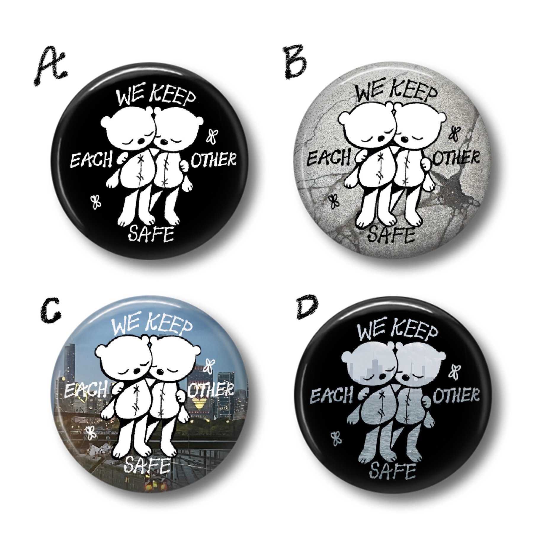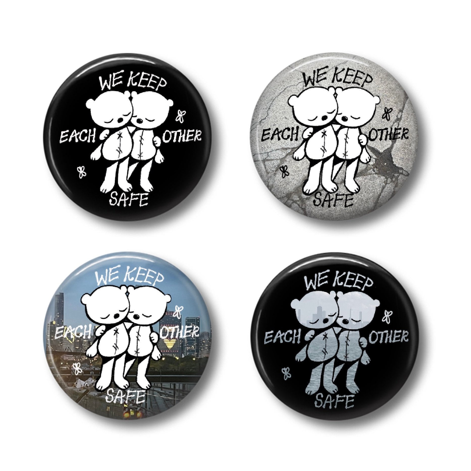 large buttons to fundraise for the midwest immigration bond fund and the chicago street vendor relief fund.